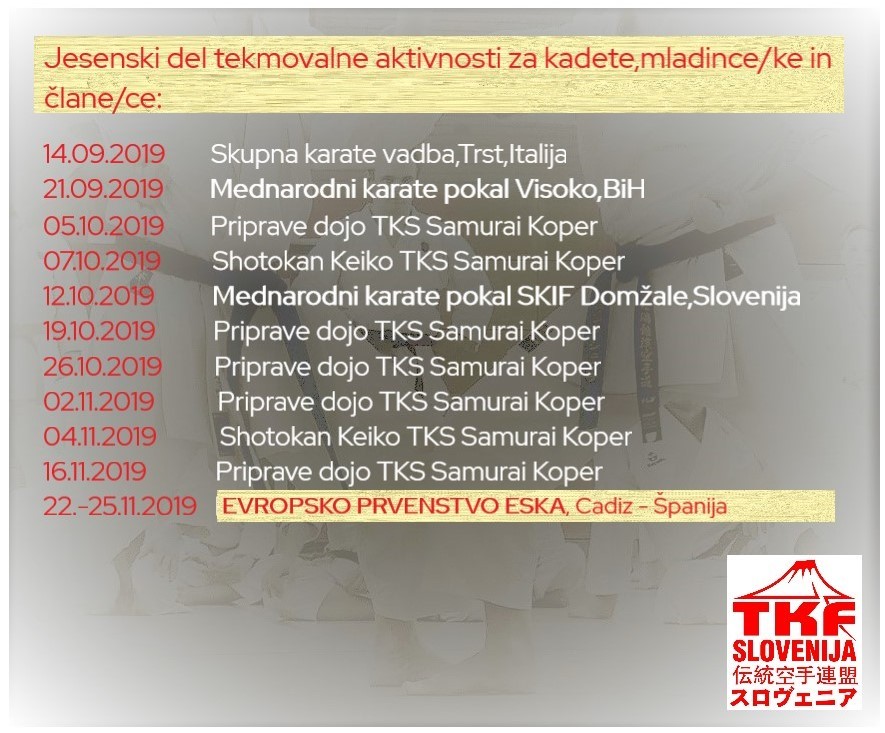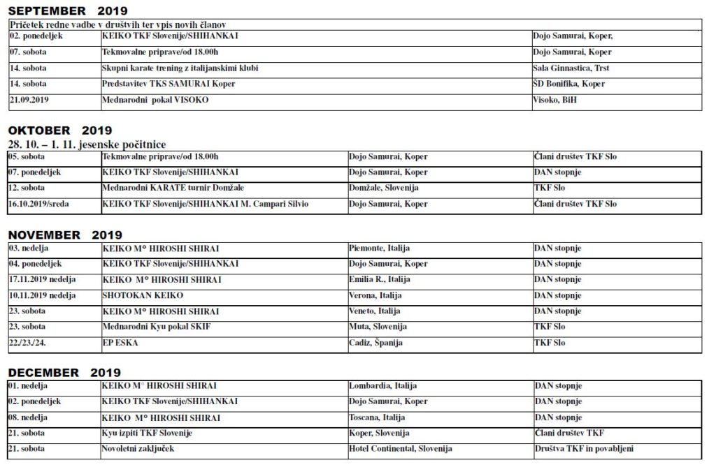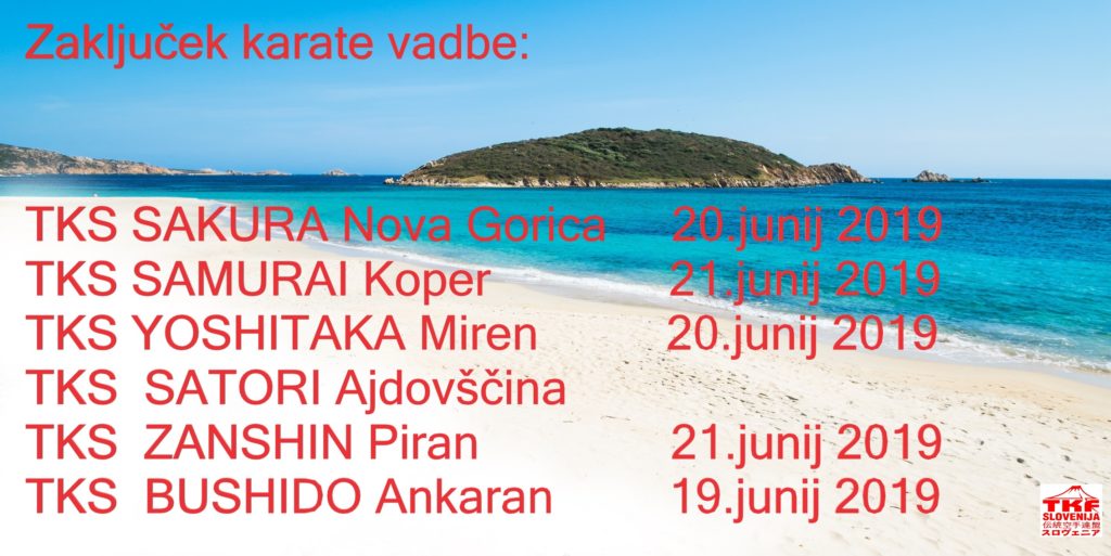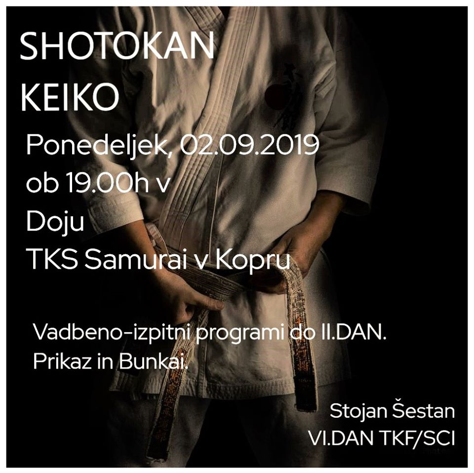 Naši instruktorji FREDI RAVNIK (TKS ZANSHIN Portorož), MILOŠ COTIČ (TKS YOHITAKA Miren) in DORJAN FLEGO (TKS SAMURAI Koper) so dne 13. junija 2019 prejeli diplome za naziv TRENER KLASIČNEGA KARATEJA. Diplome je podelil M° DUŠAN […]